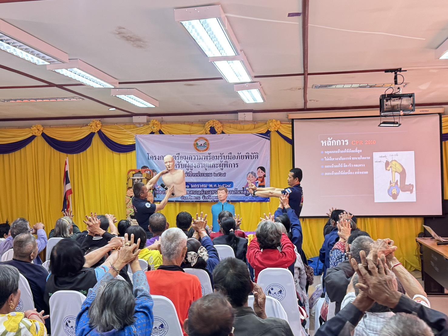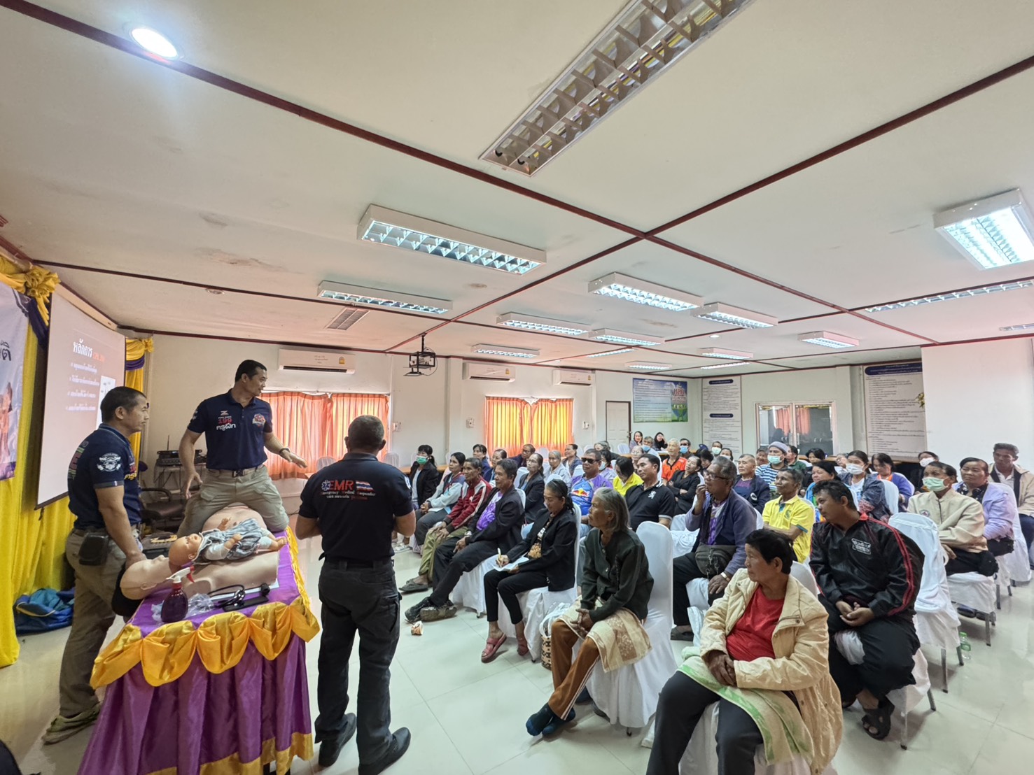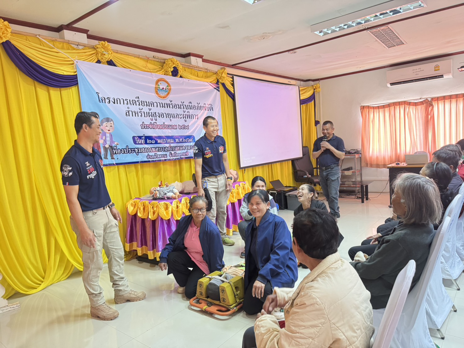 วันพุธที่ 21 มกราคม 2569 ณ.เทศบาลตำบลหนองแวงแก้มหอมิ โดยนายโกมล พินิจมนตรี นายกเทศมนตรีตำบลหนองแวงแก้มหอม เป็นเกียรติมาเป็นประธานในพิธีเปิดโครงการฯ การดำเนินโครงการดังกล่าวมีวัตถุประสงค์เพื่อเสริมสร้างความรู้ความชำนาญในการรับมือภัยพิบัติฉุกเฉินเบื้องต้นและสามารถพึ่งพาตนเองได้อย่างปลอดภัย ลดความสูญเสียในชีวิตและทรัพย์สินของประชาชน ในการฝึกอบรมในครั้งนี้มีผู้เข้าร่วมอบรมจำนวนทั้งหมด 50 คนกลุ่ม เป้าหมายได้แก่ผู้สูงอายุและพิการ อาสาสมัครสาธารณสุขประจำหมู่บ้าน อาสาสมัครป้องกันภัยฝ่ายพลเรือน,ประชาชนทั่วไปรวมถึงวิทยากรผู้เชียวชาญ